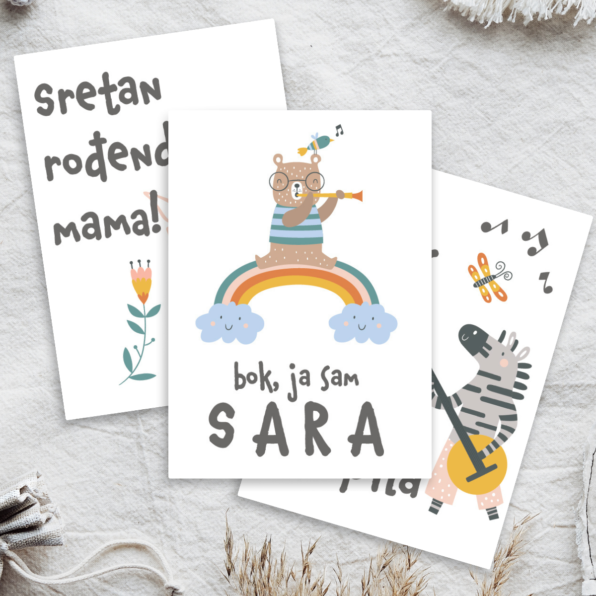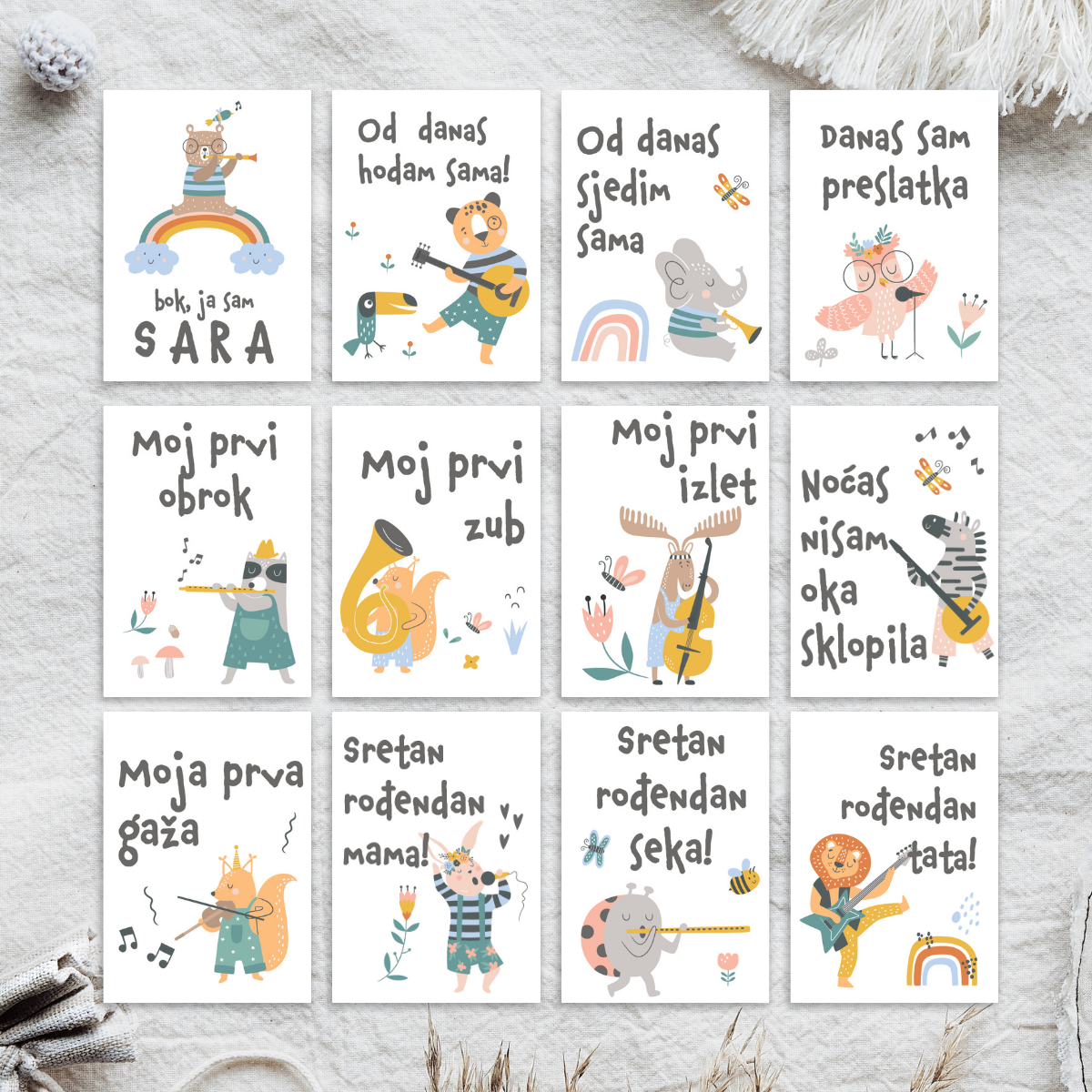 Svaka kartica može sadržavati ime djeteta ili druge osobne detalje, čime postaje jedinstvena uspomena i personalizirani poklon za bebu. Personalizacija je uključena u cijenu i dizajnirana tako da se skladno uklopi u vizualni stil seta.