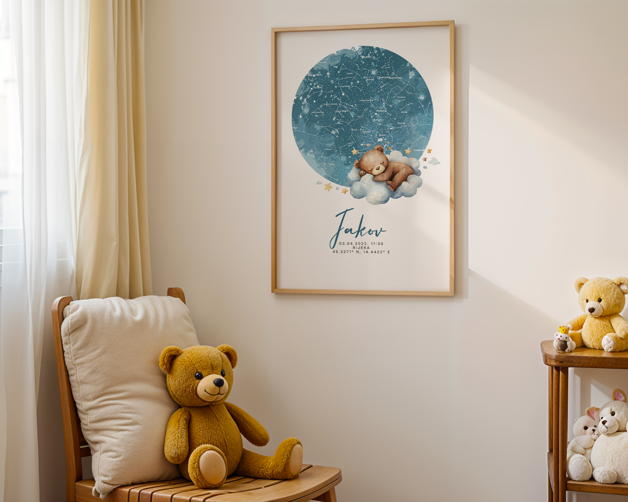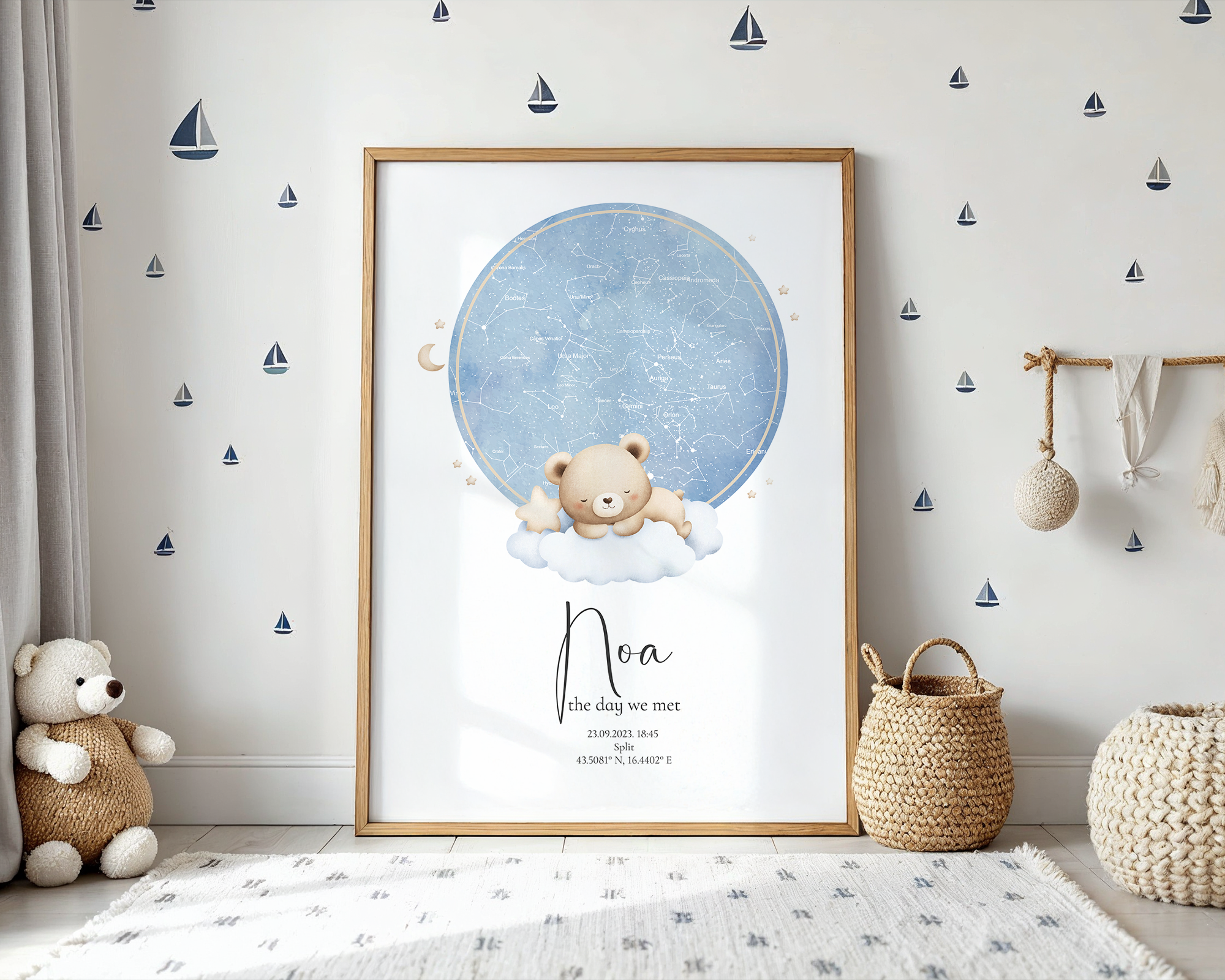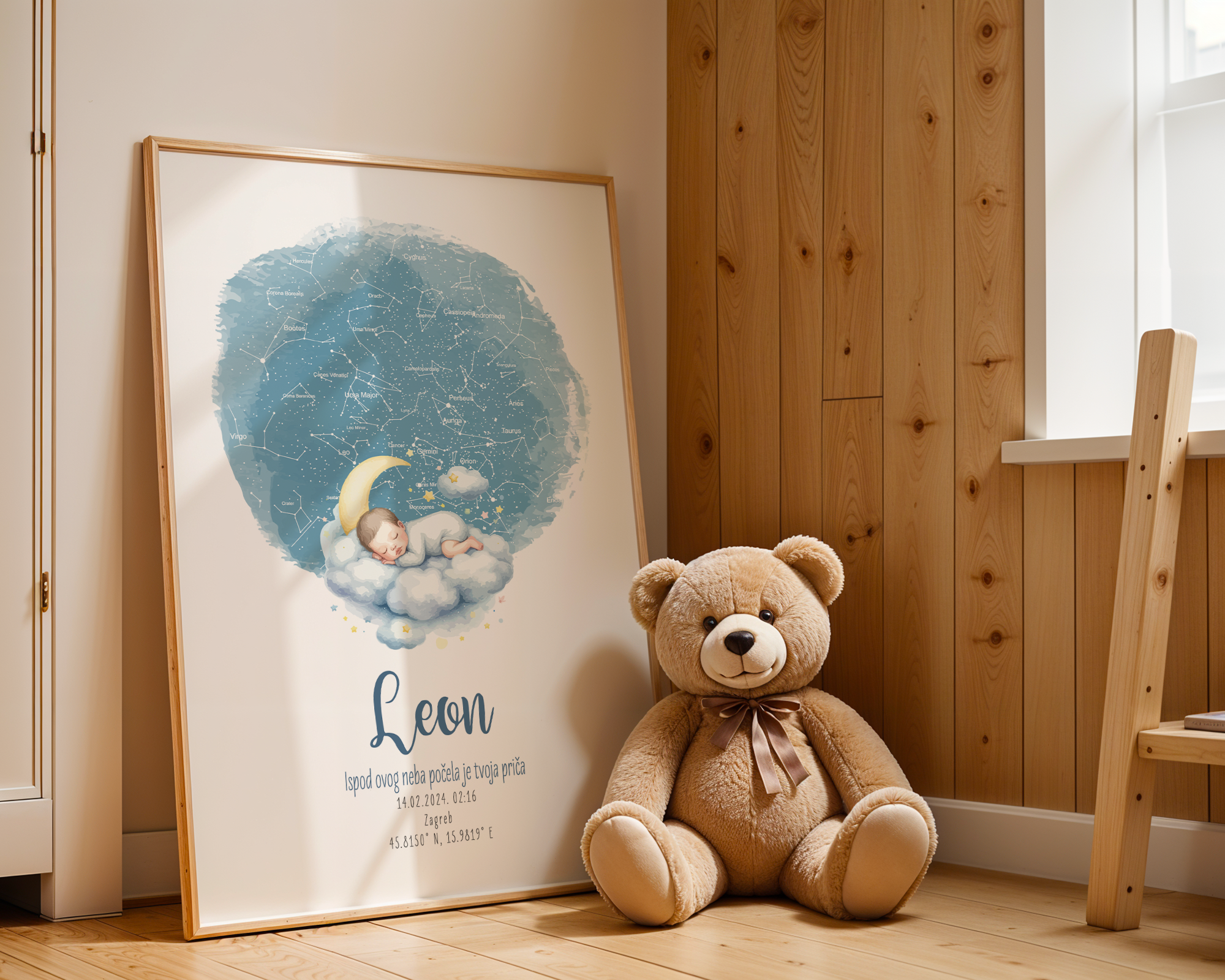 Dostupan je u više stilova – s prikazom zvjezdanog neba ili karte grada/mjesta rođenja, uz ilustracije u pastelnoj paleti koje se mogu prilagoditi spolu ili tonu sobe (npr. neutralno, rozo, plavo, bež…).