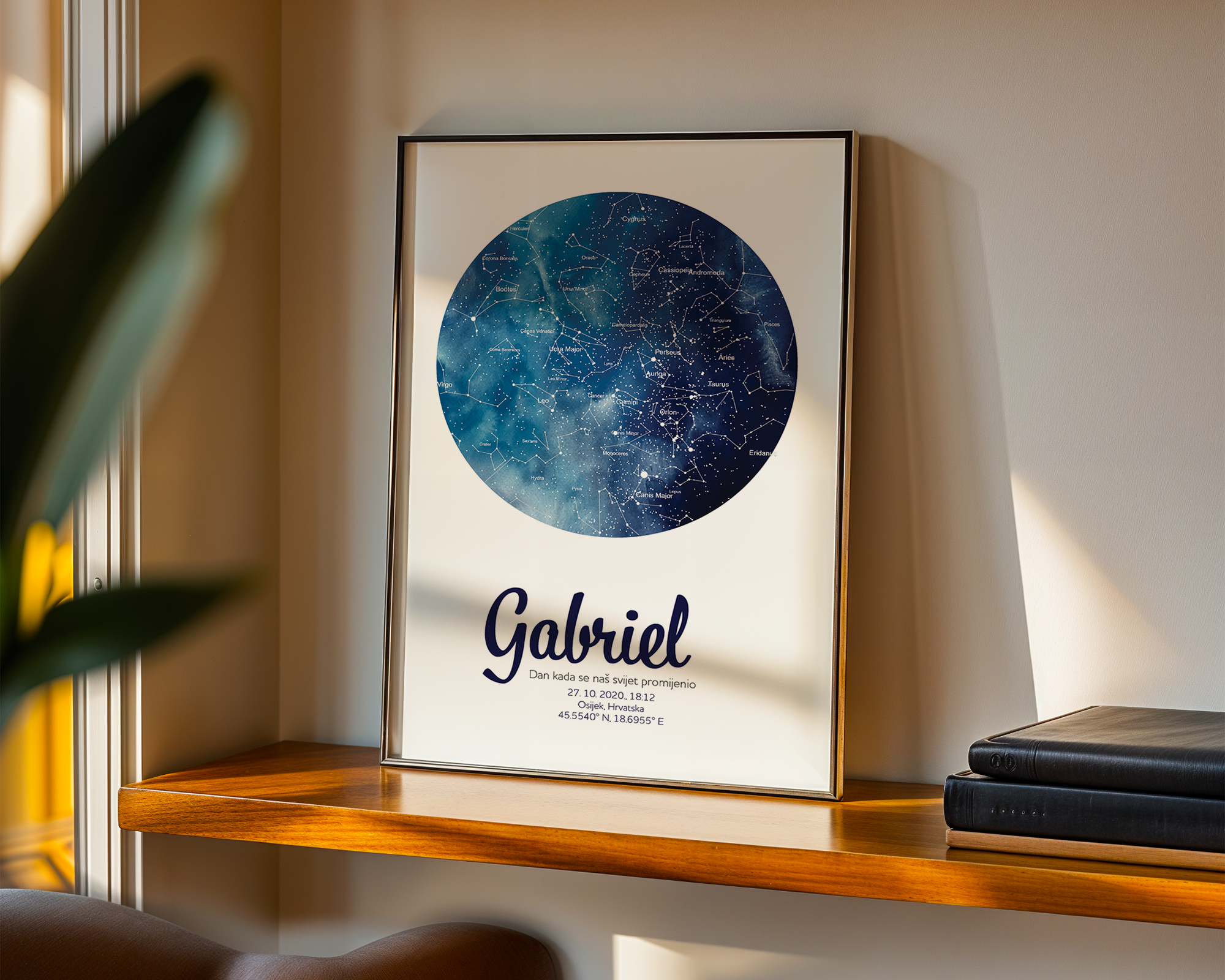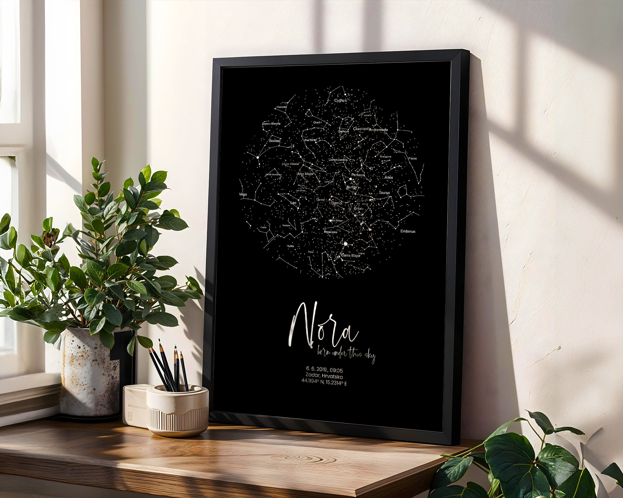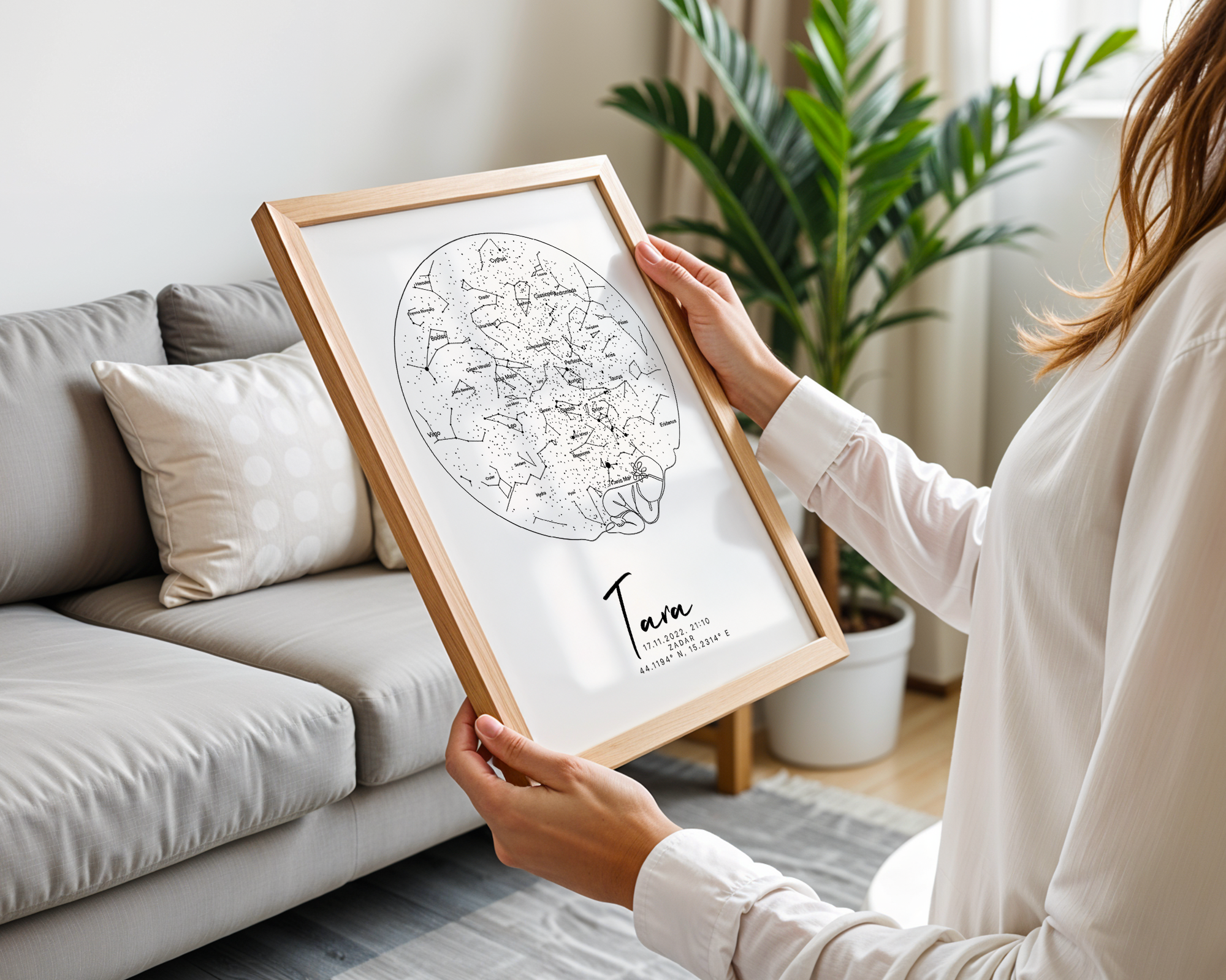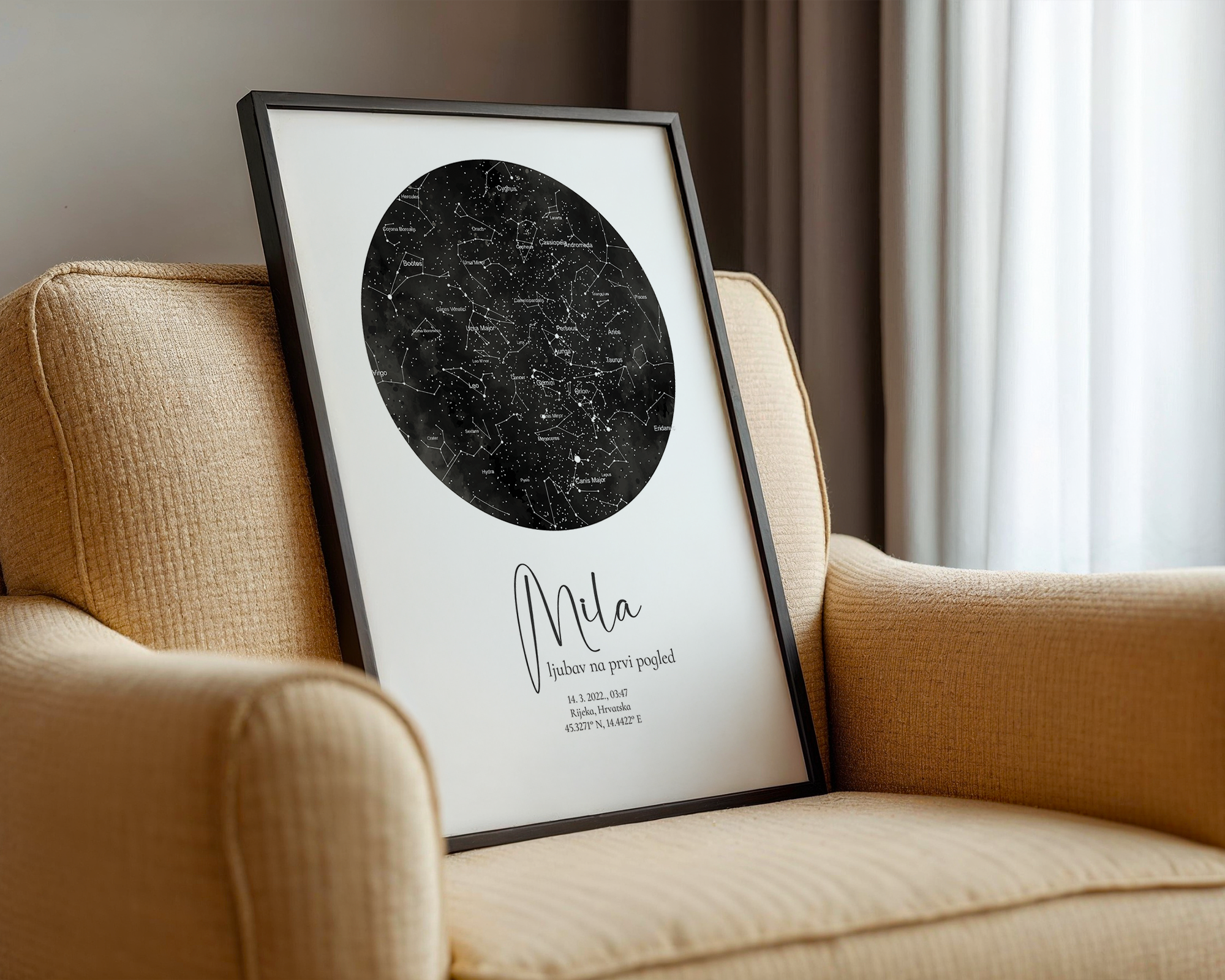Dostupan je u više stilova – s prikazom zvjezdanog neba ili karte grada/mjesta rođenja, uz ilustracije u pastelnoj paleti koje se mogu prilagoditi spolu ili tonu sobe (npr. neutralno, rozo, plavo, bež…).