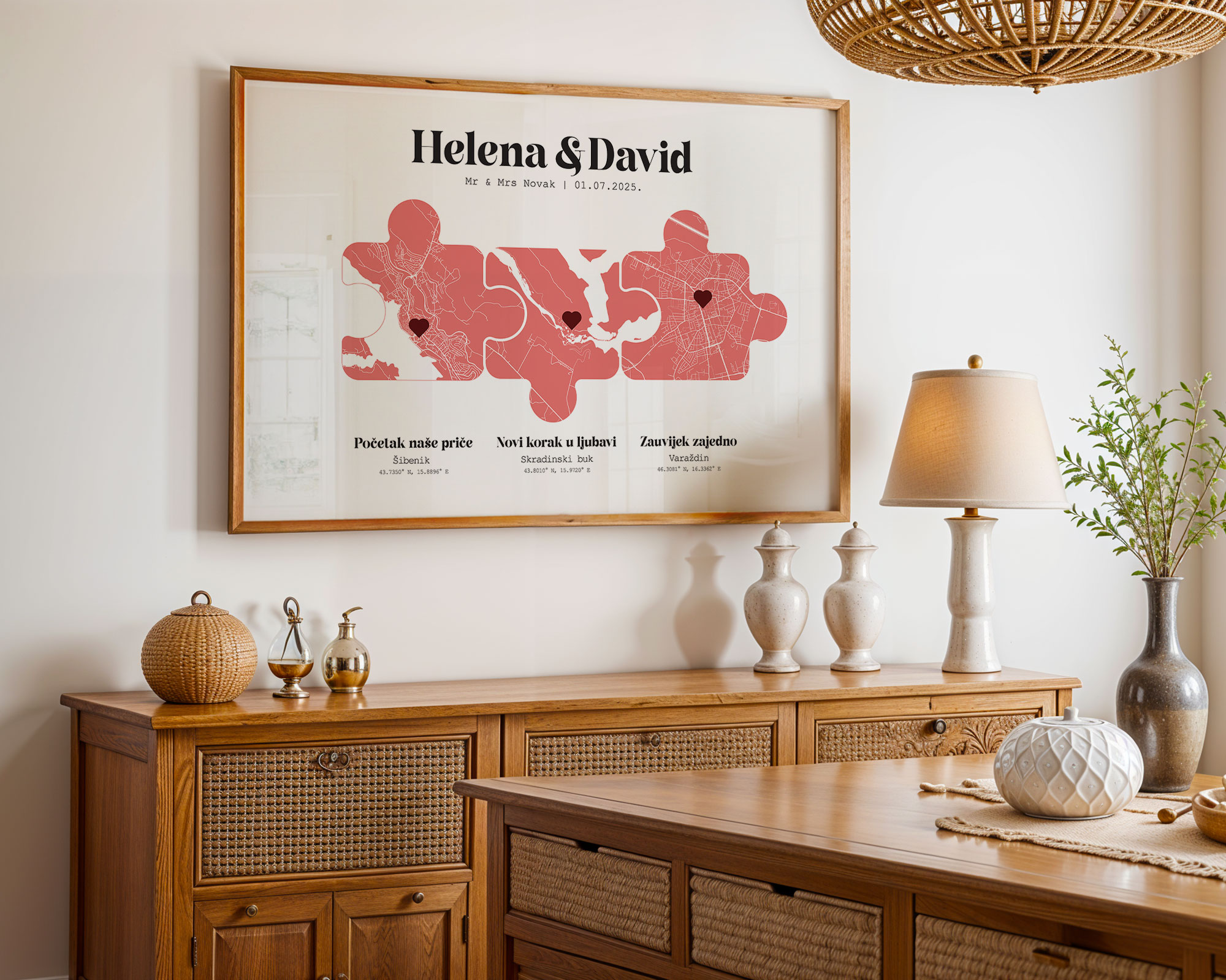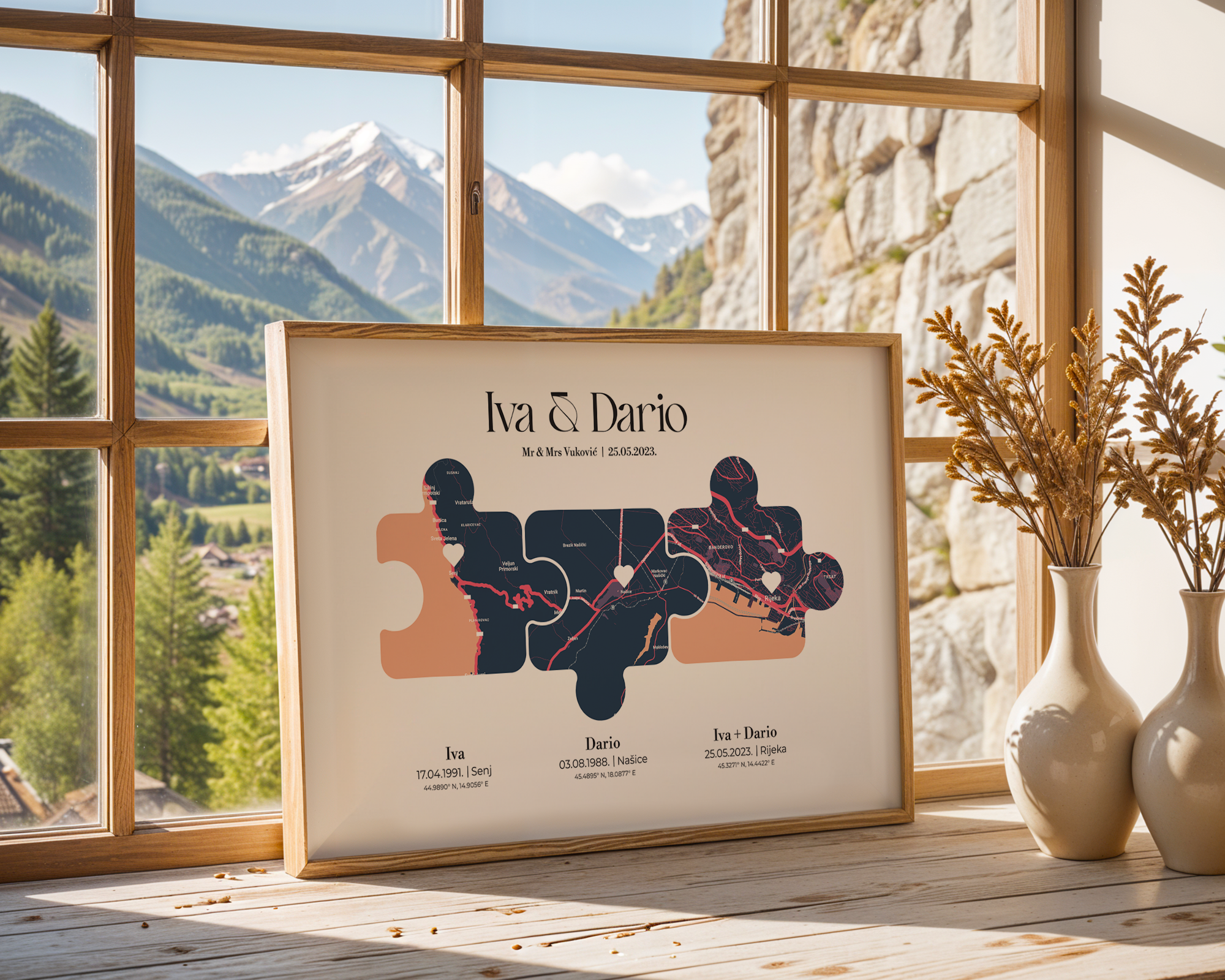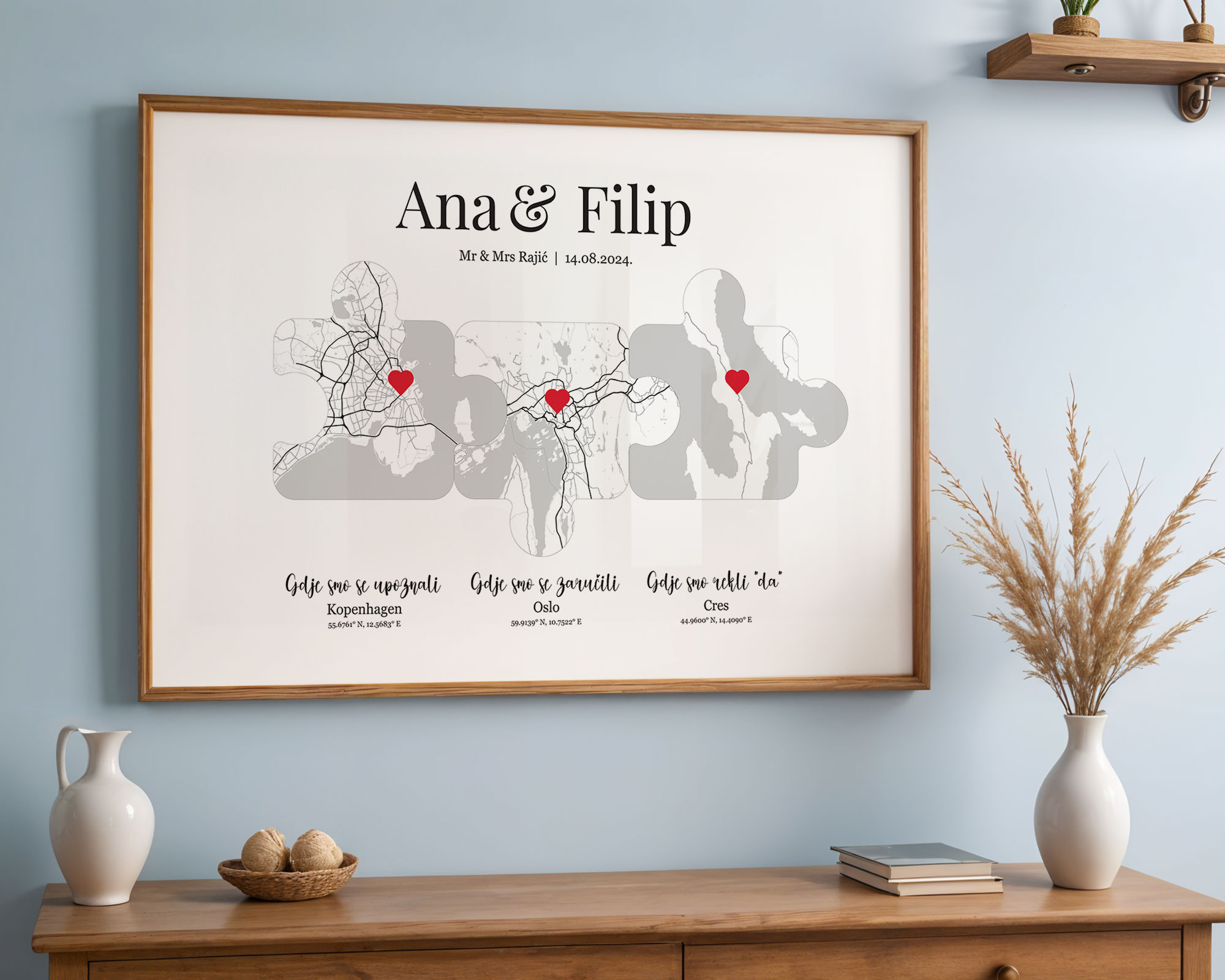 Personalizirani poster s 3 karte u obliku puzzli – prikazuje važna mjesta u vašoj ljubavnoj priči. Imena, datumi i koordinate uključeni. Idealno za poklon.