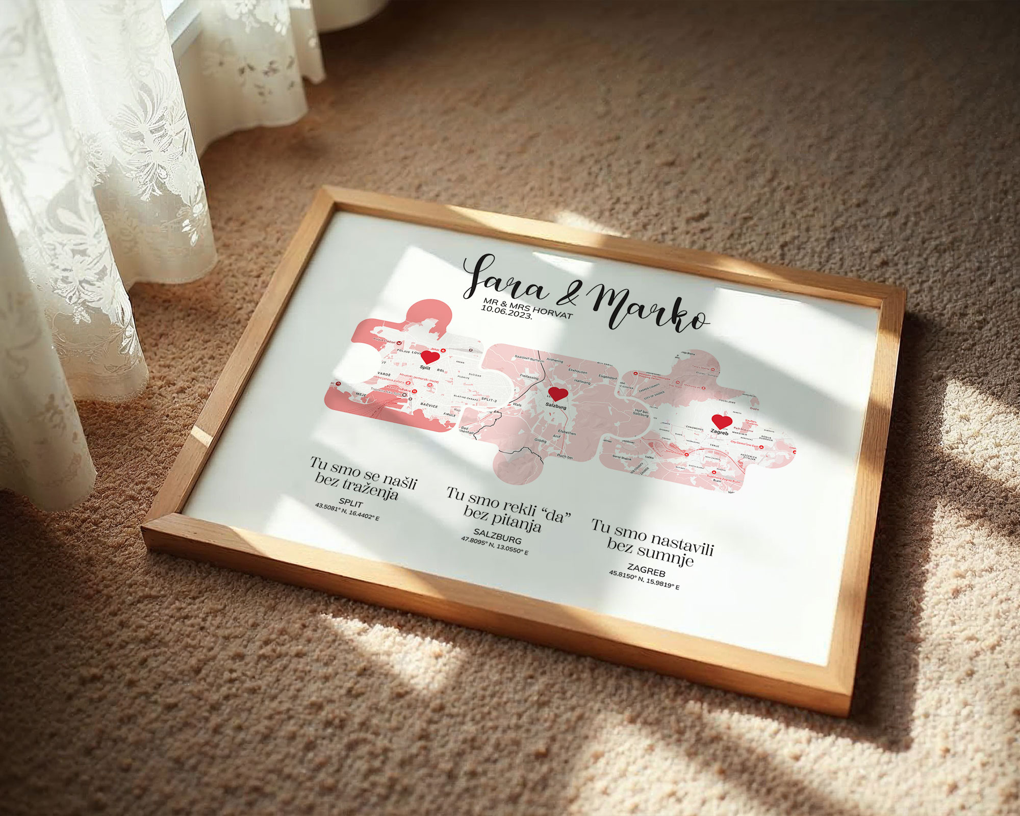 Poster Puzzle je personalizirani poster koji prikazuje tri najvažnija mjesta u vašoj zajedničkoj priči – u obliku slagalice. Svaki komad puzzle predstavlja jedno važno mjesto i trenutak: mjesto upoznavanja, zaruka, vjenčanja, mjesto rođenja, ili bilo koji drugi značajan događaj koji želite zauvijek sačuvati.