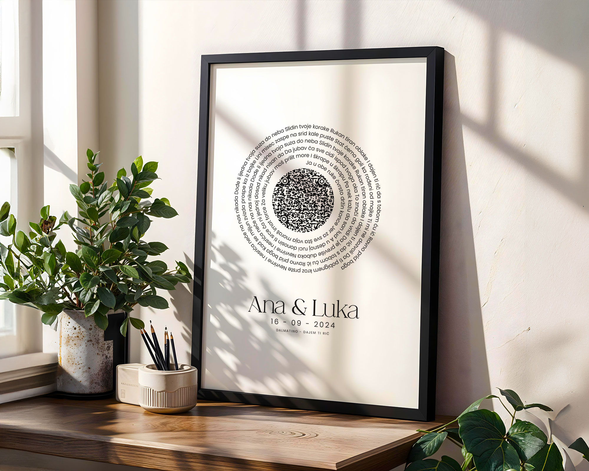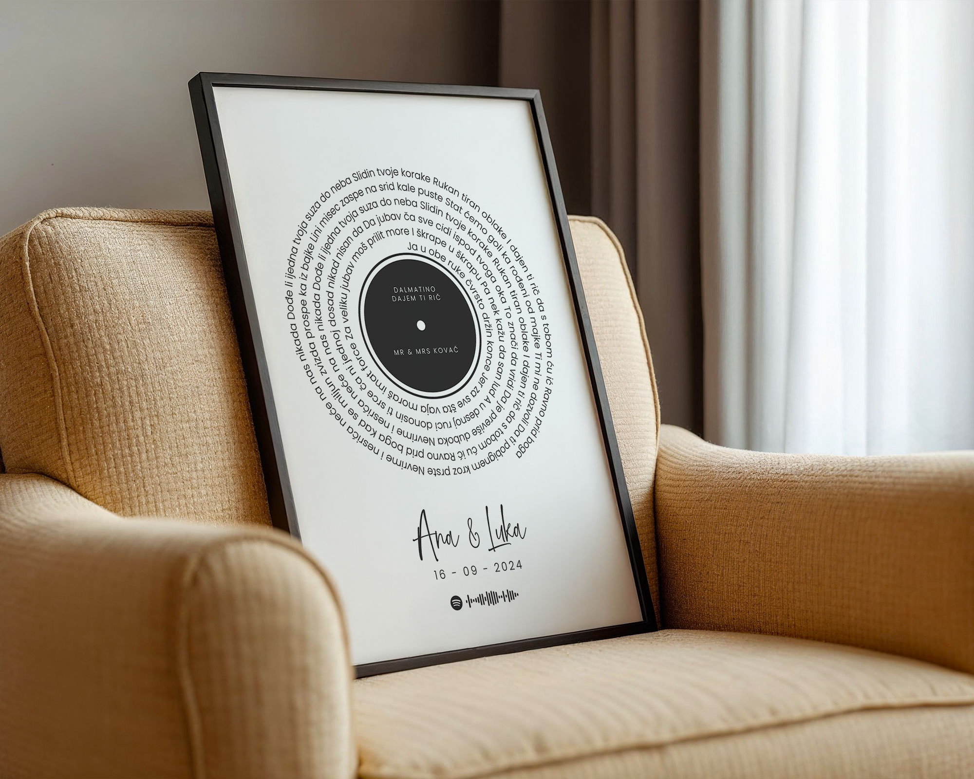 Personalizirani glazbeni poster u obliku vinila s imenom para, datumom, pjesmom i QR kodom. Idealno kao poklon za mladence ili godišnjicu braka.