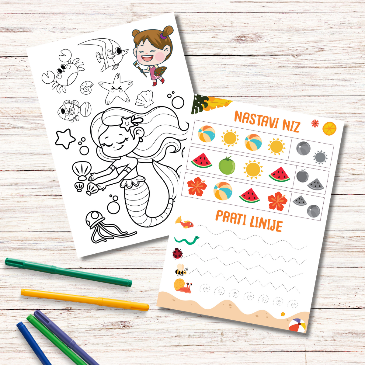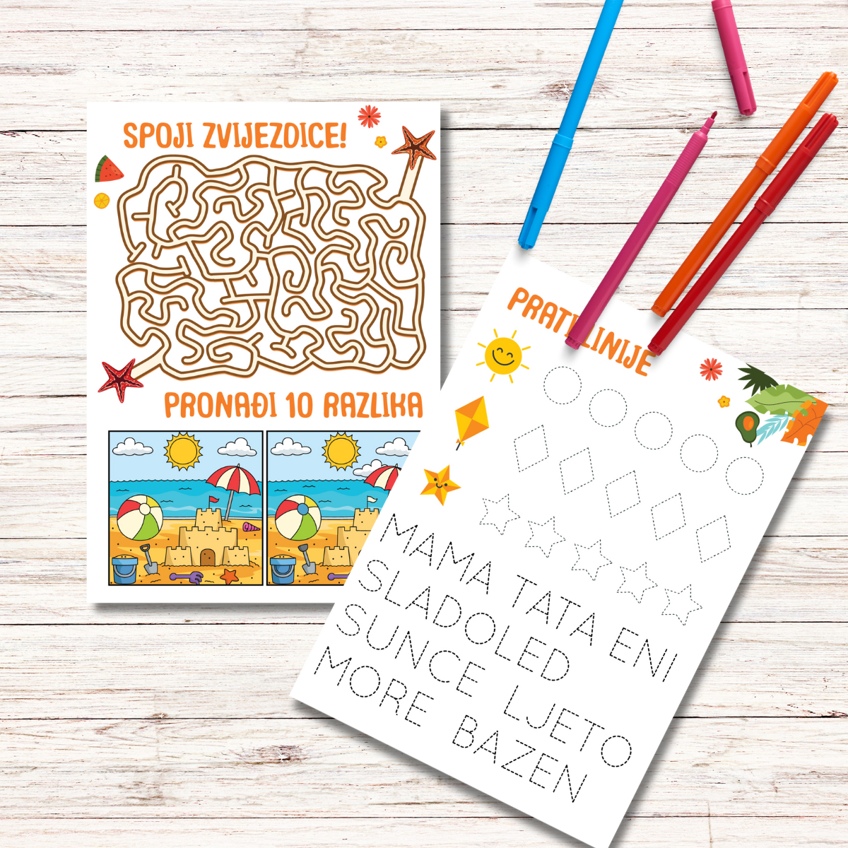 Radni listovi s ljetnom temom za djecu 3–7 godina. Zadatci za razvoj motorike, pažnje i logike. Dostupno digitalno i kao piši-briši plastificirani set.